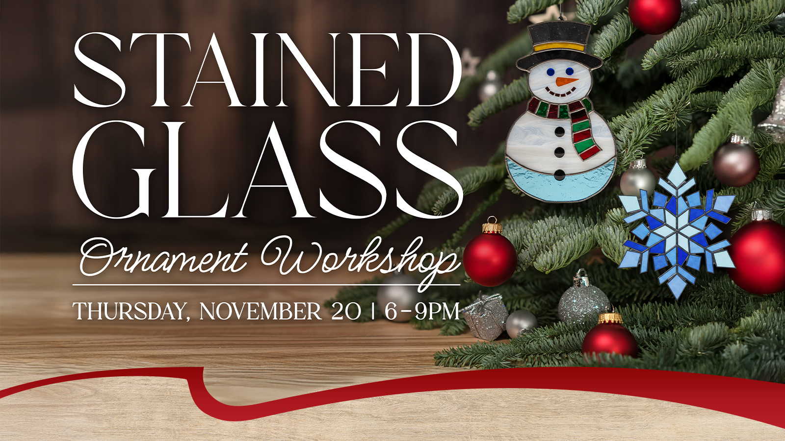 Join us for a Stained Glass Ornament Workshop where you’ll design your own holiday keepsake! Choose your glass, pick your ornament shape, and solder it together step by step. Enjoy complimentary red and white sangria while you craft something beautiful and festive.