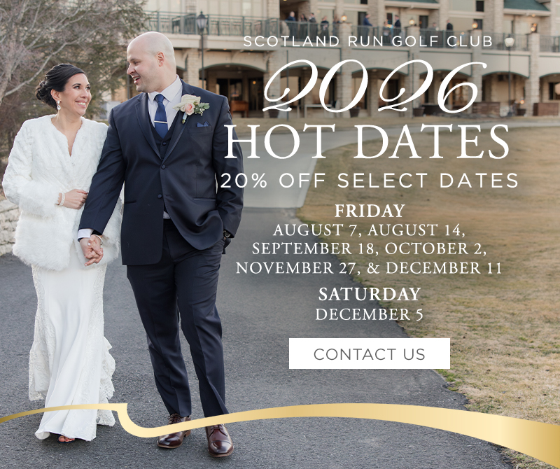 Exchange vows in our enchanting Botanical Pavilion surrounded by vibrant seasonal blooms, then celebrate in our beautifully renovated ballroom featuring hardwood floors, grand windows, and sweeping views of our award-winning golf course. From lush outdoor ceremonies to sophisticated receptions, Scotland Run is the premier wedding venue for couples dreaming of a picture-perfect day.